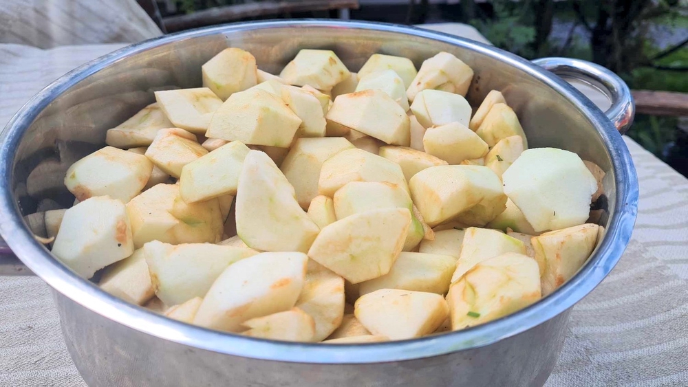 Täytä maijan ylin osa omenapaloilla. Jos haluat sokeroida mehun, pistä joukkoon haluamasi määrä sokeria. Omassa maijassani yläosa tuli lähes täyteen omppupaloja ja laitoin sekaan myös hieman taloussokeria. Sekaan voi laittaa myös kanelitangon.