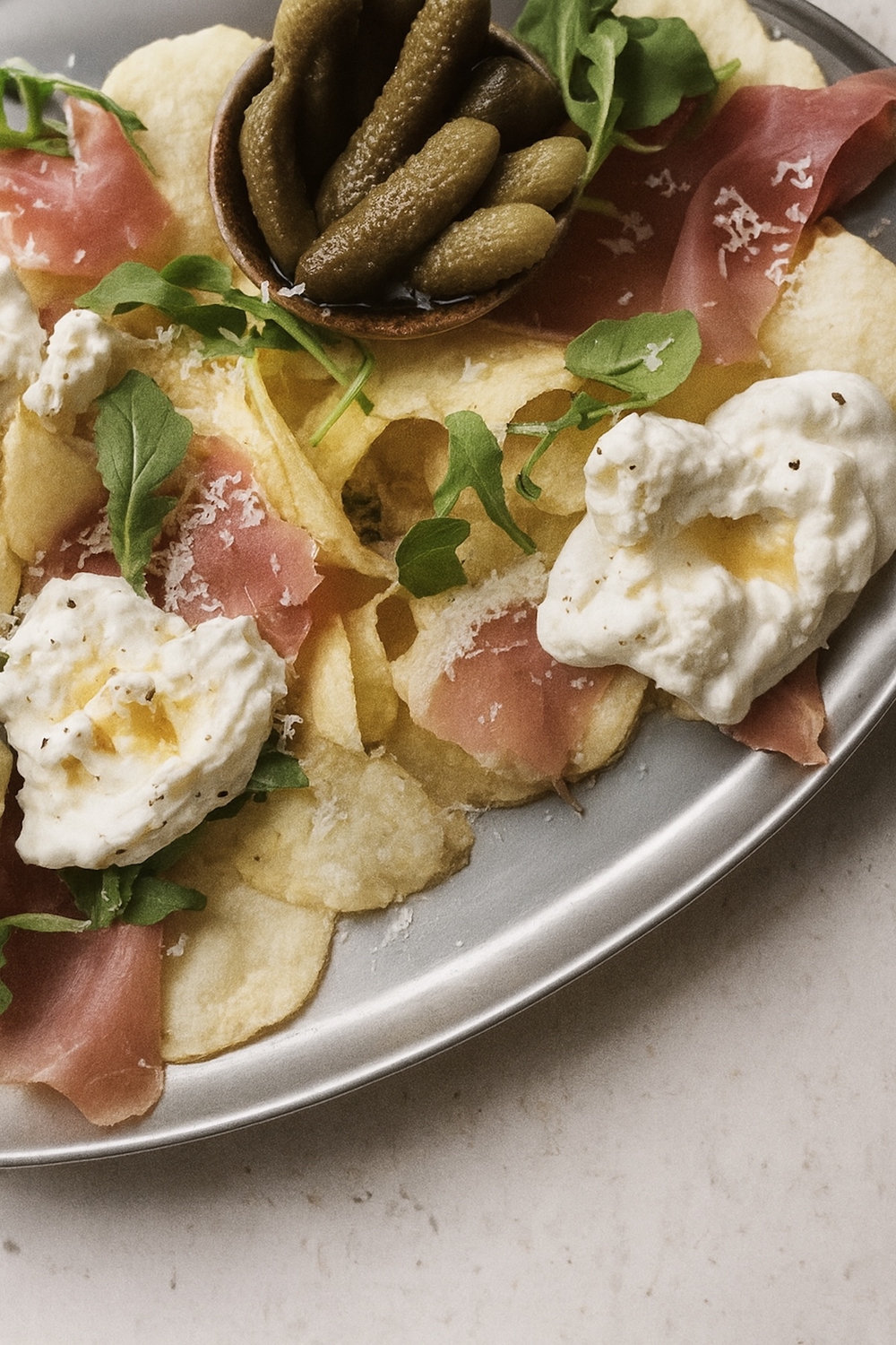 Levitä perunalastut vadille ja raasta päälle parmesan. Asettele ilmakuivatut kinkkurullat kevyesti lastujen lomaan. Lisää reunoille pienet kulhot suolakurkuille, oliiveille ja pikkelöidylle punasipulille. Nostele mozzarellapallot päälle. Viimeistele mustapippurilla ja tarjoile heti.