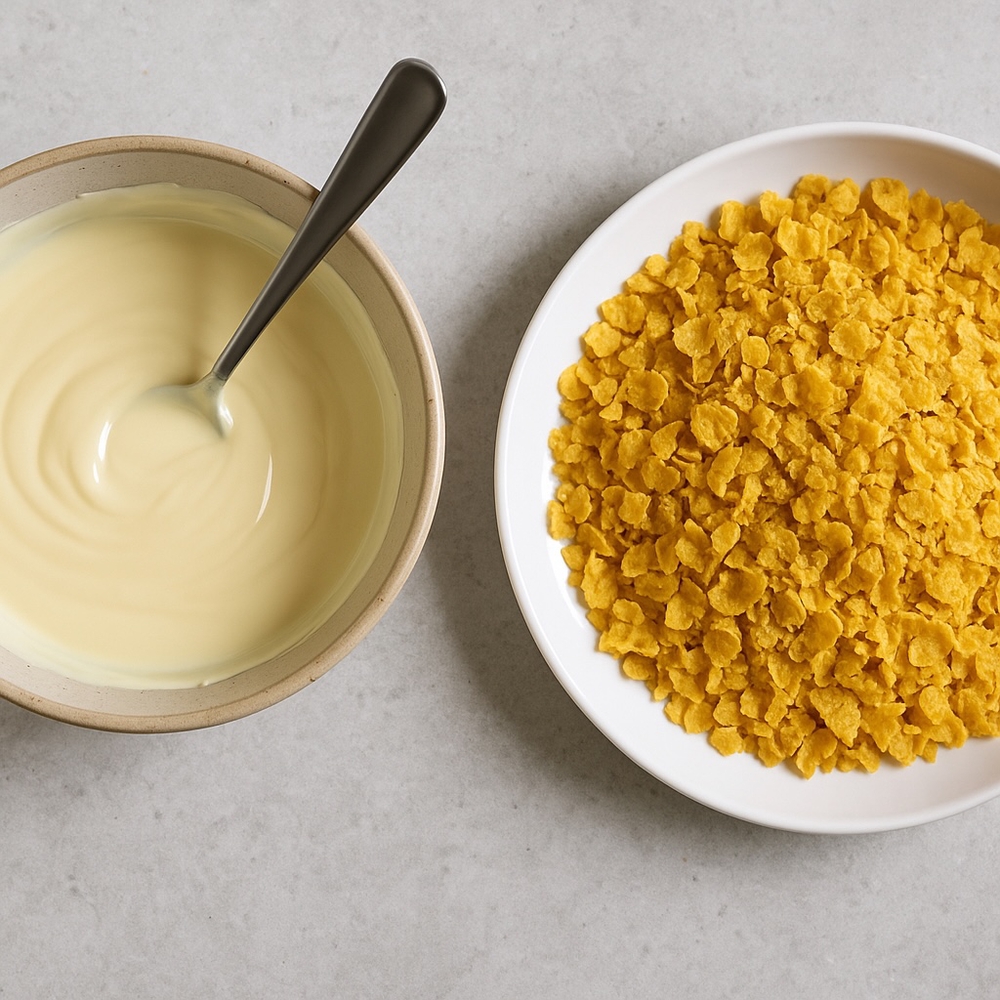 Sulata valkosuklaa ja sekoita joukkoon öljy tai kookosrasva, jotta suklaasta tulee helposti levittyvää. Murskaa corn flakes niin, että mukana on sekä hienompaa murua että hiukan isompia paloja.