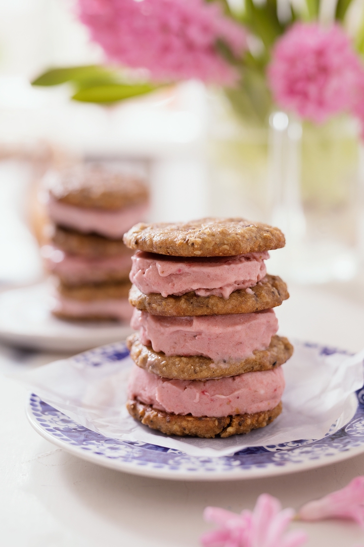 Valmista mansikka nice cream. Laita jäiset mansikat ja banaanipalat tehosekoittimeen. Lisää kookosmaito ja vaahterasiirappi. Sekoita kovalla teholla. Voit välillä pysäyttää tehosekoittimen ja kaapia aineksia reunoilta keskelle, jotta lopputulos olisi tasainen. Täytä jäähtyneet keksit mansikka nice creamilla ja laita pakastimeen jähmettymään vielä vähintään puoleksi tunniksi, jotta jäätelö pysyy keksien sisällä.